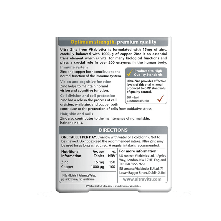 مکمل اولترا زینک ویتابیوتیکس (Vitabiotics Ultra Zinc with Copper) یکی از محصولات باکیفیت و پرفروش شرکت معتبر Vitabiotics انگلستان است. این مکمل ترکیبی از زینک (روی) و مس (Copper) میباشد که نقش مهمی در حفظ سلامت سیستم ایمنی، پوست، مو و ناخن ایفا میکند. ویتابیوتیکس با سالها تجربه در تولید مکملهای تخصصی، اطمینان خاطر از کیفیت و اثربخشی این محصول را فراهم کرده است