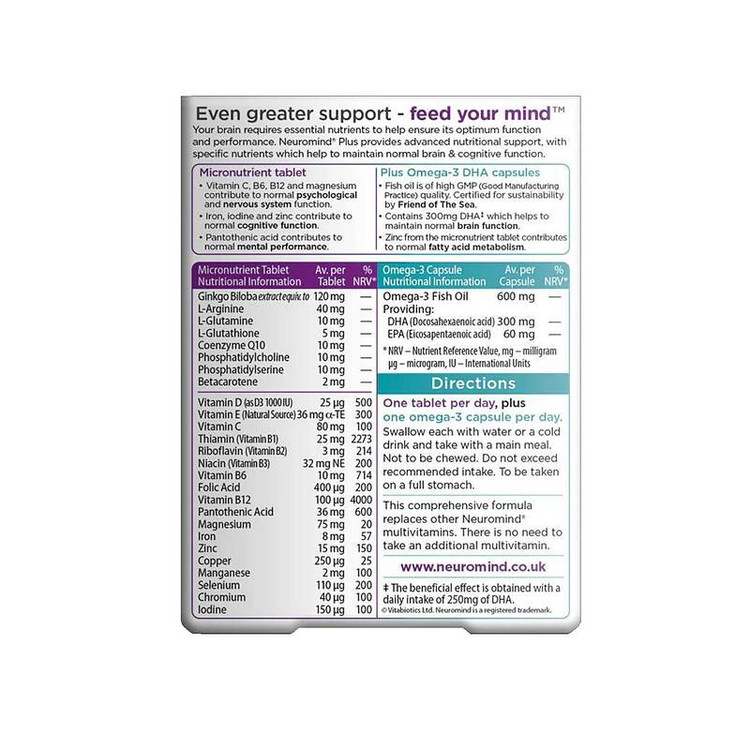 نرومایند پلاس ویتابیوتیکس (Vitabiotics Neuromind Plus DHA) یکی از قویترین مکملهای تقویت عملکرد ذهن و حافظه است که توسط برند معتبر انگلیسی Vitabiotics تولید شده.