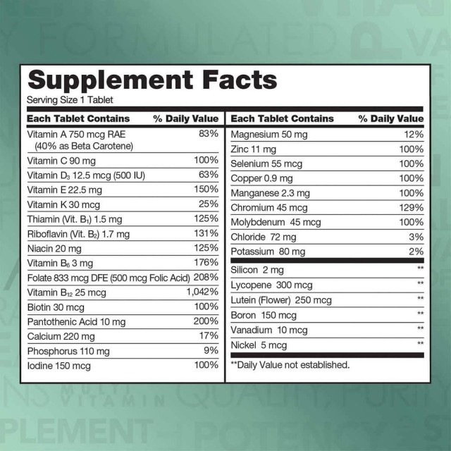 - این مولتی ویتامین شامل ترکیبی از ویتامینها و مواد معدنی است که بهطور خاص برای افراد بالای ۵۰ سال فرموله شده است. این فرمول شامل کلسیم، ویتامین D، ویتامینهای گروه B، و آنتیاکسیدانها مانند ویتامین C و E میباشد.