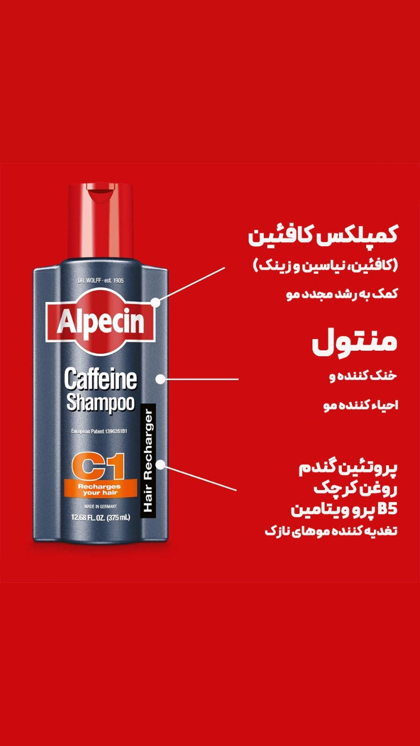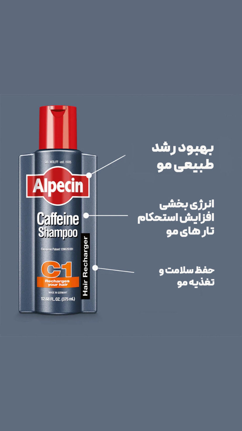 شامپو C1 آلپسین دارای مقدار زیادی کافئین میباشد و این امر باعث تحریک فولیکول های مو و خنثی کردن اثرات تستوسترون می شود.