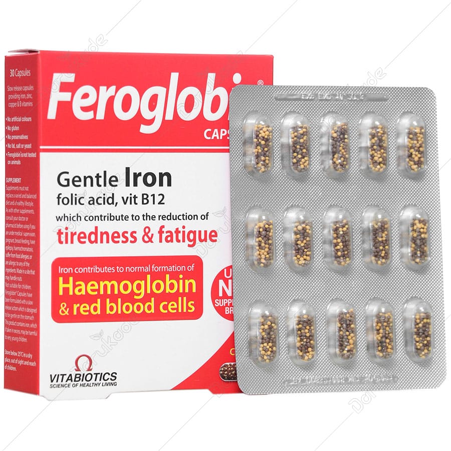 کپسول فروگلوبین محصول ویتابیوتیکس انگلستان است که در بسته های 30 عددی عرضه شده است.